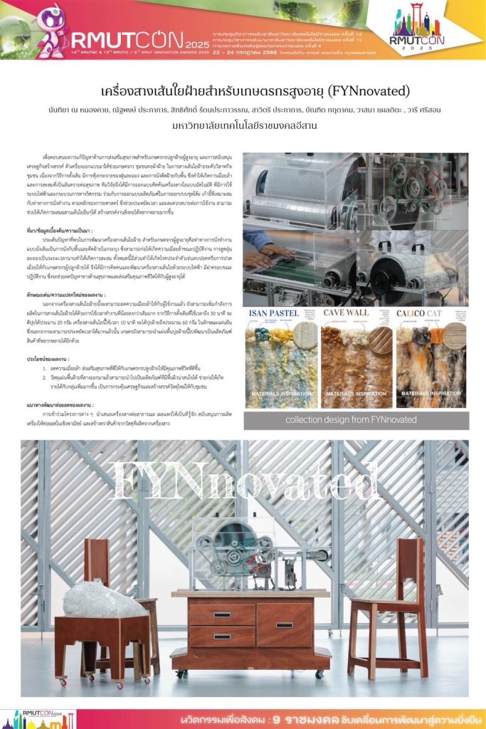 สำหรับผลงาน “เครื่องสางเส้นใยสำหรับเกษตรกรสูงอายุ (FYNnovated)” เป็นนวัตกรรมที่ถูกออกแบบและพัฒนาขึ้นเพื่อช่วยเหลือและลดภาระการทำงานให้กับเกษตรกร โดยเฉพาะกลุ่มผู้สูงอายุ ให้สามารถทำงานได้อย่างสะดวกและมีประสิทธิภาพมากขึ้น ซึ่งถือเป็นนวัตกรรมที่ตอบโจทย์การพัฒนาสังคมอย่างยั่งยืน