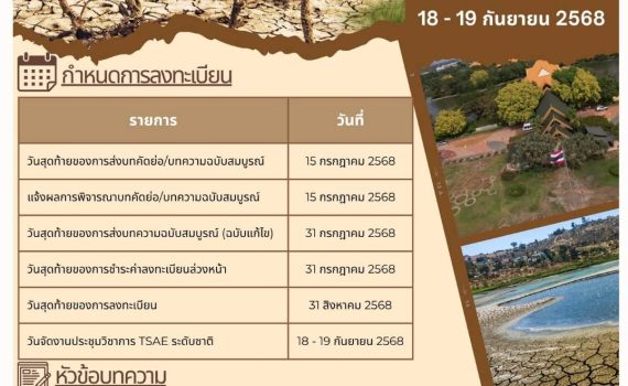 ขอเชิญคณาจารย์ นักวิจัย บุคลากร และนักศึกษา ร่วมเป็นส่วนหนึ่งของการประชุมวิชาการระดับชาติ สมาคมวิศวกรรมเกษตรแห่งประเทศไทย ครั้งที่ 26 ภายใต้แนวคิด “การเกษตรที่ยั่งยืนสำหรับเอเชีย” (Climate Resilient Agriculture for Asia) ซึ่งจะจัดขึ้นในระหว่างวันที่ 18 – 19 กันยายน 2568 ณ พิพิธภัณฑ์การเกษตรเฉลิมพระเกียรติพระบาทสมเด็จพระเจ้าอยู่หัว อำเภอคลองหลวง จังหวัดปทุมธานี การประชุมครั้งนี้เป็นเวทีสำคัญสำหรับการนำเสนอและแลกเปลี่ยนความรู้ทางวิชาการด้านวิศวกรรมเกษตรและสาขาที่เกี่ยวข้อง โดยครอบคลุมหัวข้อที่น่าสนใจดังนี้: กำหนดการและวันสำคัญ: อัตราค่าลงทะเบียน: ตารางกำหนดการโดยสังเขป (18-19 กันยายน 2568): กิจกรรมภายในงานประกอบด้วย พิธีเปิด, การบรรยายพิเศษโดยผู้ทรงคุณวุฒิ อาทิ หัวข้อ “การตรวจสอบคุณภาพผลไม้ส่งออกด้วยเทคนิคแม่เหล็กไฟฟ้า” โดย รองศาสตราจารย์ ดร. ชาญชัย ทองโลหา, การนำเสนอผลงานวิจัยแบบบรรยาย, การประชุมสมาชิกสมาคมฯ และงานเลี้ยงต้อนรับ นอกจากนี้ ในวันที่สองจะมีการนำเสนอผลงานวิจัยอย่างต่อเนื่อง การประกาศรางวัล […]