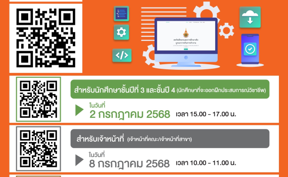 ศูนย์สหกิจศึกษาและพัฒนาอาชีพ มหาวิทยาลัยเทคโนโลยีราชมงคลอีสาน ขอเชิญนักศึกษา อาจารย์ และเจ้าหน้าที่ เข้าร่วมอบรมการใช้งานระบบสารสนเทศสำหรับการฝึกประสบการณ์วิชาชีพนักศึกษา (ระบบฝึกประสบการณ์) เพื่อเตรียมความพร้อมก่อนเข้าสู่กระบวนการฝึกงานในภาคการศึกษาที่ 2/2568 โดยการอบรมจะจัดในรูปแบบออนไลน์ผ่านระบบ Microsoft Teams วัตถุประสงค์ของการอบรมเพื่อให้ผู้เกี่ยวข้องทุกฝ่ายสามารถใช้งานระบบได้อย่างถูกต้องและมีประสิทธิภาพ พร้อมเข้าใจขั้นตอนการดำเนินงานและบทบาทหน้าที่ของตนเองในกระบวนการฝึกประสบการณ์ กลุ่มเป้าหมายและกำหนดการอบรม การลงทะเบียนสามารถลงทะเบียนเข้าร่วมอบรมได้โดยสแกน QR Code ที่ปรากฏในเอกสารประชาสัมพันธ์ สอบถามข้อมูลเพิ่มเติมโทรศัพท์: 044-233000 ต่อ 2780–2783เว็บไซต์: https://coop.rmuti.ac.thอีเมล: coop@rmuti.ac.th การอบรมในครั้งนี้ถือเป็นขั้นตอนสำคัญในการเตรียมความพร้อมของนักศึกษาและบุคลากร เพื่อสนับสนุนการดำเนินงานด้านฝึกประสบการณ์วิชาชีพให้เป็นระบบและมีคุณภาพ มหาวิทยาลัยจึงขอเชิญทุกท่านเข้าร่วมกิจกรรมอย่างพร้อมเพรียง
